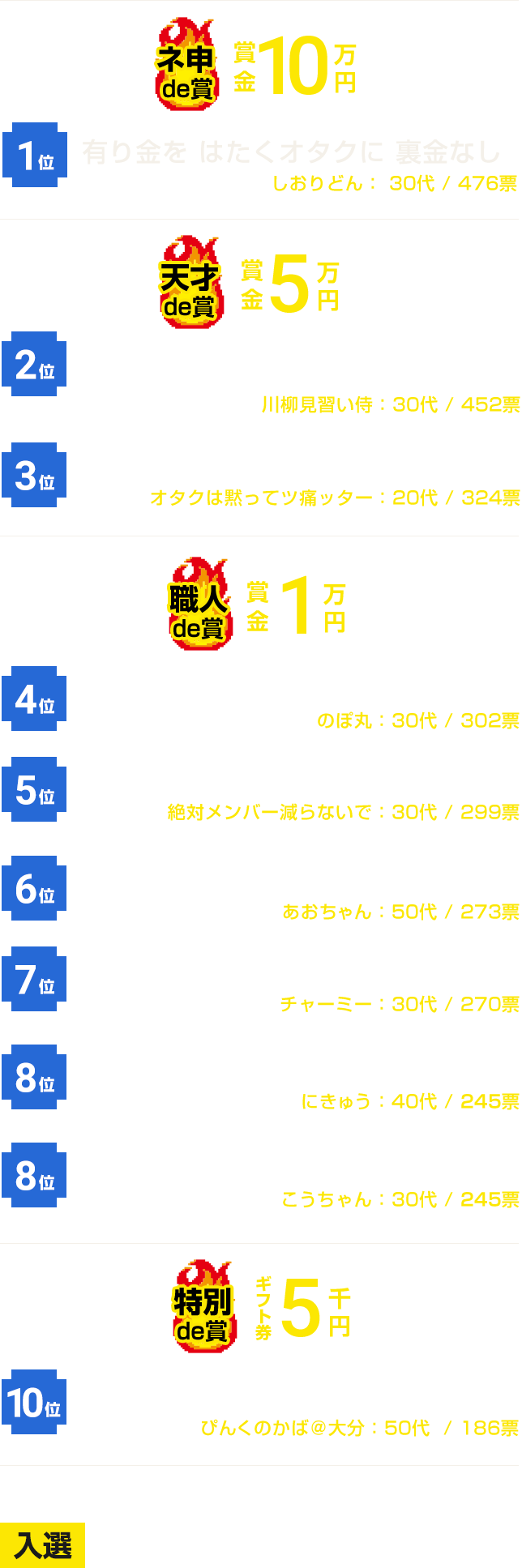 | 11位 | 雑談も 地雷だらけよ 界隈は (ちゅんすけ:50代/179票) |