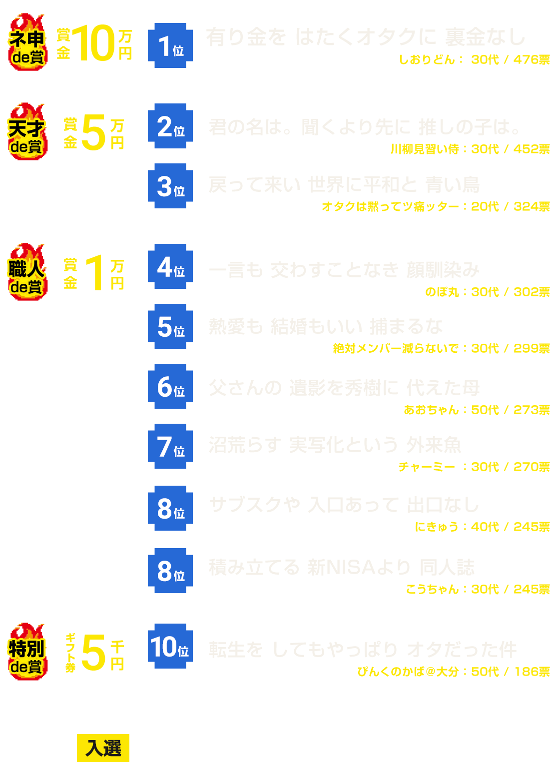 - 2025/3/14 第20回あなたが選ぶオタク川柳大賞&猫耳イラストコンテスト結果発表